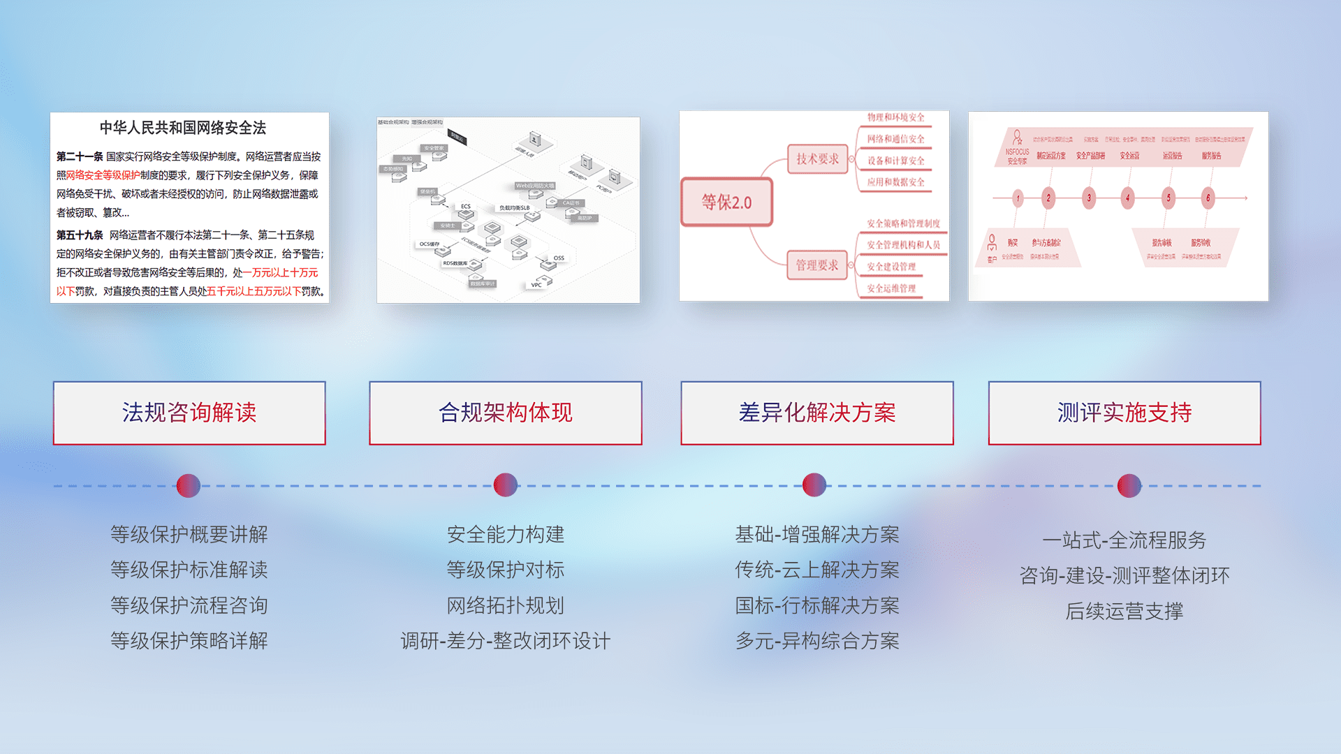 通过专业的法律咨询解读、、合规架构体现、、、、差异化解决方案、、测试实施支持等服务,,为客户量身打造等保合规体系。。。。
